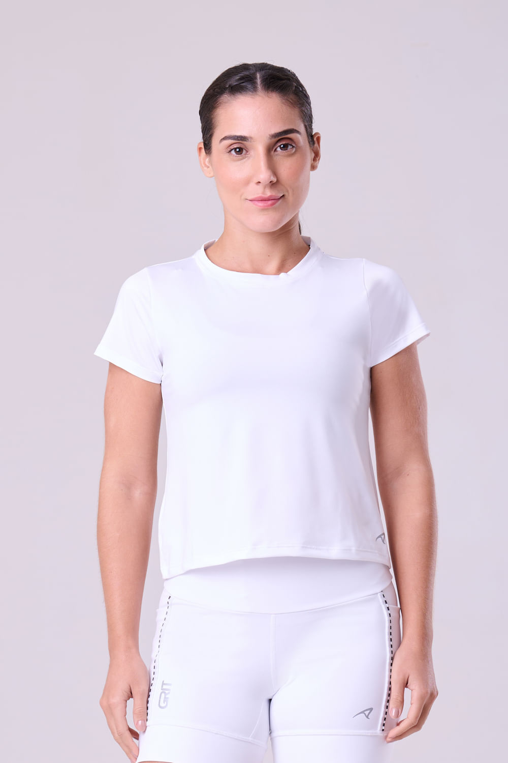 4. Decote alto e modelagem cropped, justa porém não colada ao corpo;