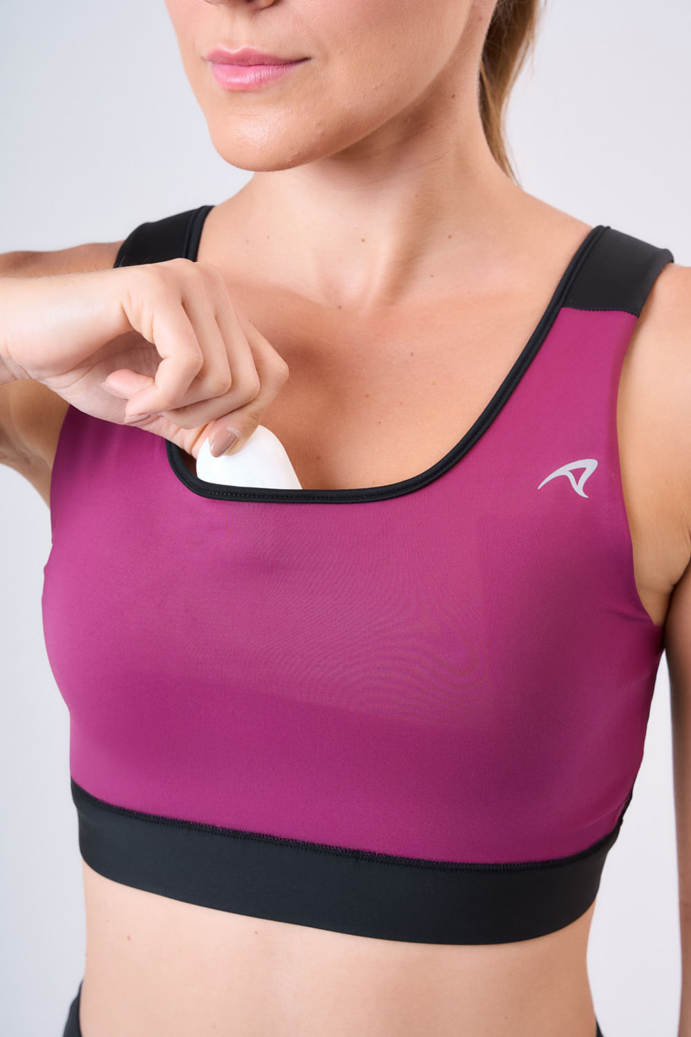 6. Forro com costura vertical no centro que bloqueia o deslocamento do bojo, garantindo que ele permaneça no mesmo lugar do início ao fim da corrida;