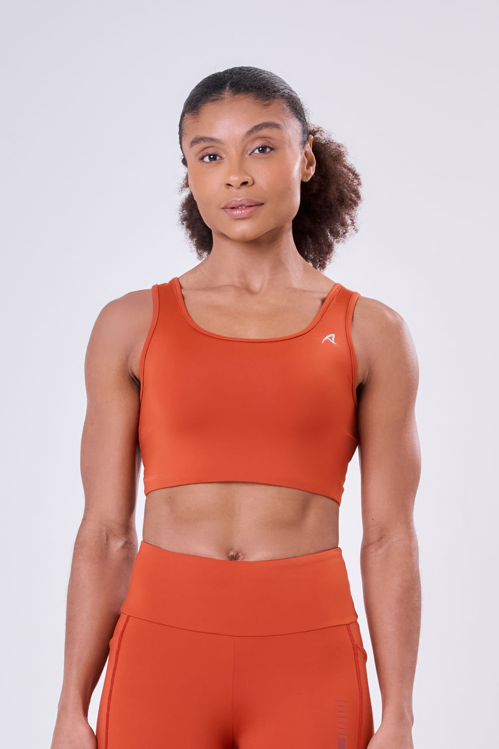 2. Modelagem Exclusiva Authen: Top dupla face. Alças retas com distribuição anatômica de sustentação, com decote médio para maior proteção da região do colo.
